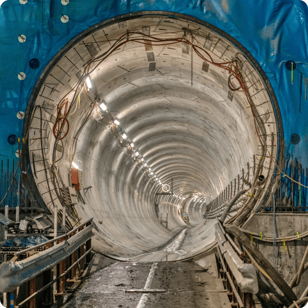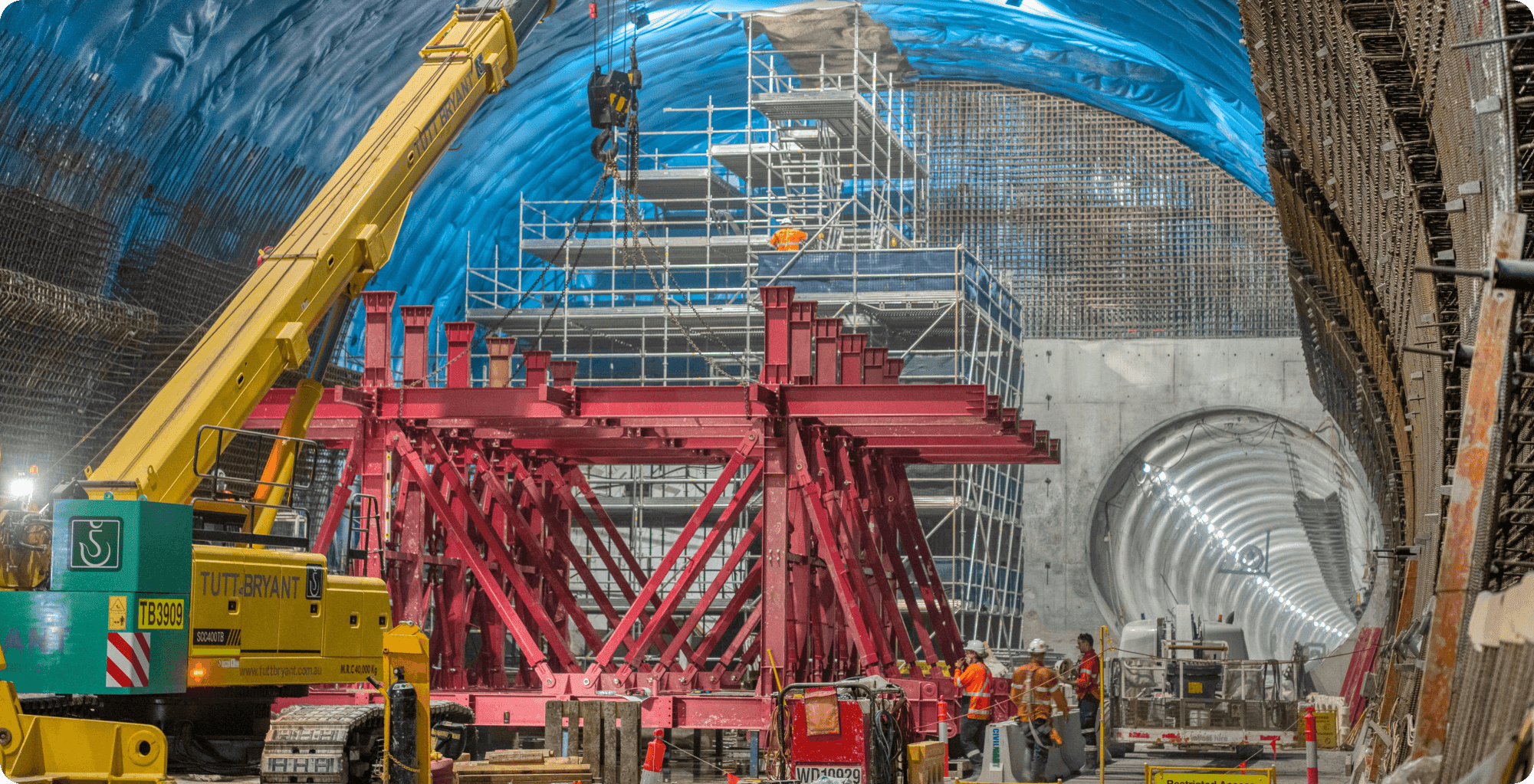 Delivery of the permanent structural lining to the 280 m long, 14 m high and 20 m wide underground cavern at Roma Street Station. The scope comprised approximately 6,500 m³ of concrete to pump, place, compact and finish and 2,000 tonnes of reinforcement to fix. The client supplied the main arch lining travelling formwork system and permanent materials, all secondary formwork, including stop-ends, kickers, headwalls, walls, suspended slabs and similar elements, together with craneage, concrete pumping, reinforcement fixing and concrete placement, was supplied and executed by the contractor.